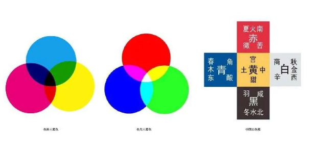 西方色彩注重物理特性和科學理論,通過給色彩明度、純度、色相三屬性編號區分不同色彩。中國傳統色彩重觀念、意象傳達,所以色彩名畫面感、表意性極強,色名豐富,如青有:蒼、碧、影青、青梅、歐碧、群青、云破天青等。五色觀中的青、赤、黃、白黑與西方現代色彩學中的三原色、白黑相對應,展現了中國先民的智慧。