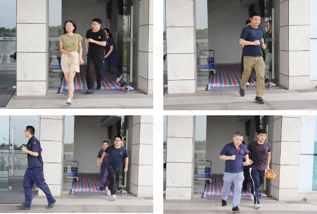 在生產車間,現場人員發現火情后,立即同步執行“上報-撲救-疏散”動作,上報險情同時,使用就近滅火器進行初期滅火,傷員得到及時救助。在檢測樓區域,辦公室人員有序疏散,在全員默契配合下,所有人員安全疏散至集合點。